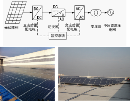 光伏屋頂電站主要由組件、支架、并網(wǎng)逆變器、變壓器、監(jiān)控系統(tǒng)等組成。組件通過支架(平屋頂采用最佳傾角安裝方式,斜屋頂采用平鋪安裝方式)安裝在屋頂上,光伏電站發(fā)的電既可以并入用戶側(cè)由用戶自發(fā)自用,也可以并入國家電網(wǎng),由電網(wǎng)統(tǒng)一分配電力。