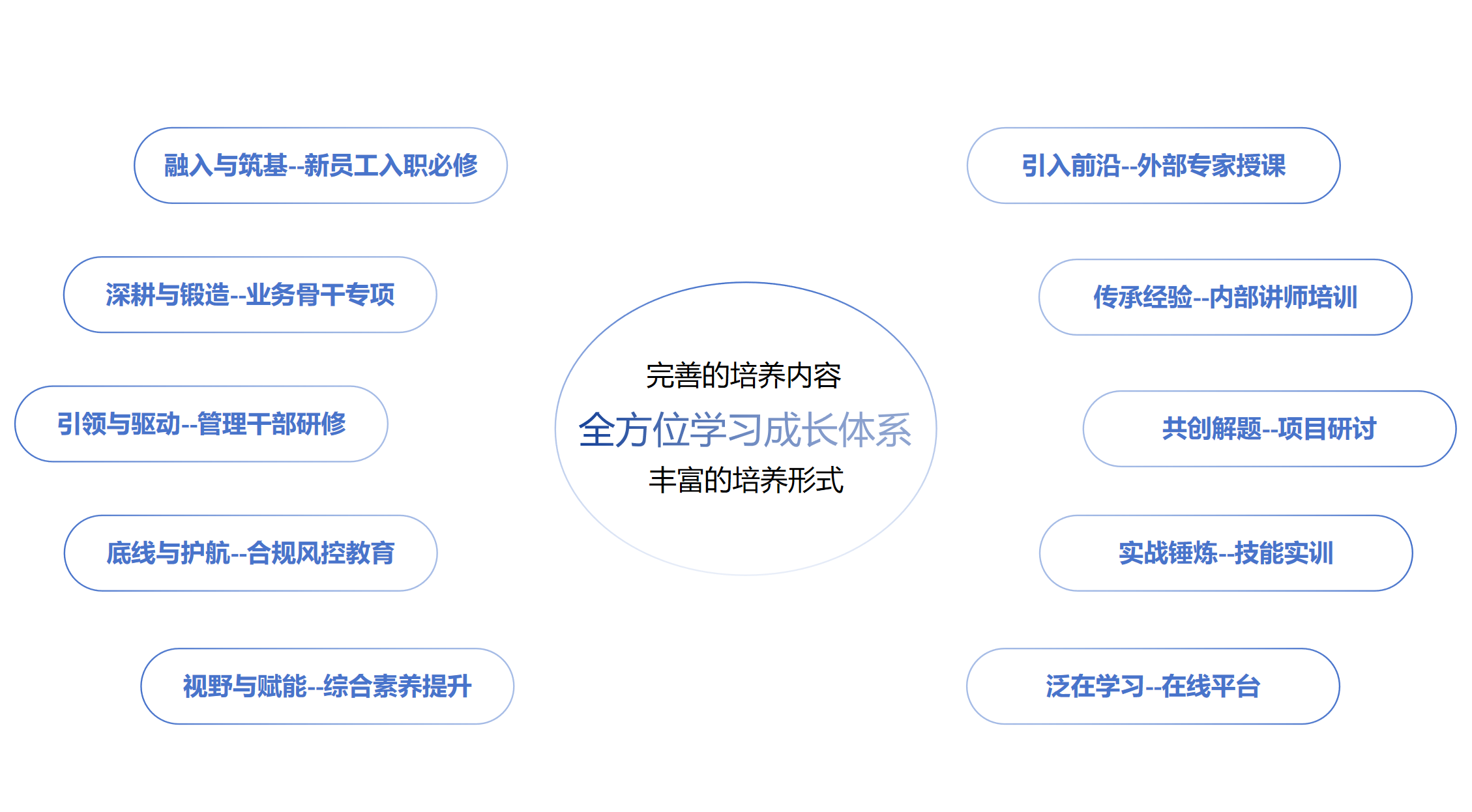 我們構(gòu)建了全方位、多層次的人才培養(yǎng)體系,覆蓋新員工入職必修課、業(yè)務(wù)骨干專項(xiàng)培訓(xùn)、管理干部研修及合規(guī)風(fēng)控教育等內(nèi)容。通過項(xiàng)目研討、技能實(shí)訓(xùn)、外部專家授課、內(nèi)部講師培訓(xùn)及在線學(xué)習(xí)平臺(tái)等豐富形式,持續(xù)提升員工的崗位技能與綜合素養(yǎng)。我們致力于打造持續(xù)成長的學(xué)習(xí)型組織,助力每一位員工在發(fā)展中實(shí)現(xiàn)自我突破,與企業(yè)共同進(jìn)步。